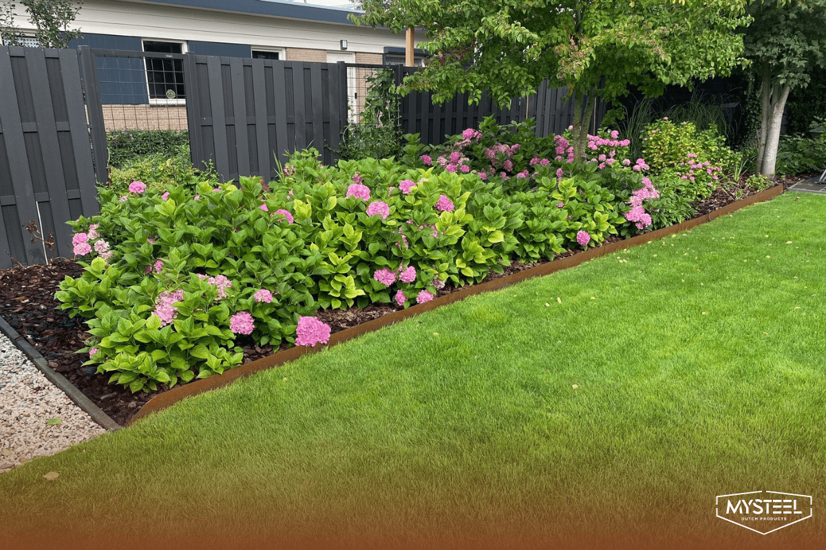 Použití cortenové oceli na předzahradě je obzvlášť populární, protože charakteristická rezavá barva má teplý vzhled a krásně kontrastuje se zelenými rostlinami.