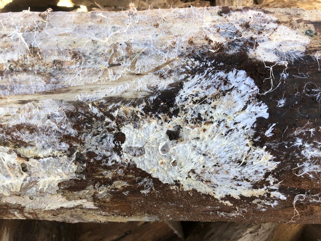 Příklad plísně na palivovém dřevu. Pokud na palivovém dřevu jasně vidíte plíseň, zlikvidujte ho. Toto dřevo není vhodné k pálení. Obrázek pochází z Mapleseed.farm.