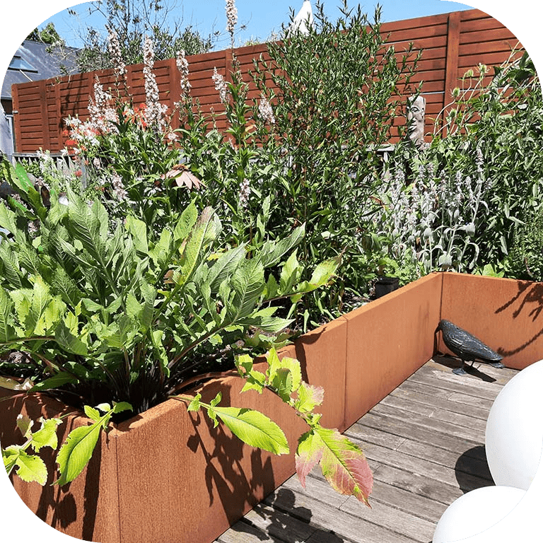 Při navrhování malé městské zahrady je důležité chytře využívat prostor. Používejte vyvýšené záhony podél okrajů, aby se maximálně využila dostupná plocha. Ocelové okrajové čáry, opěrné zdi a cortenové profily pomáhají vytvářet jasné hranice mezi různými částmi vaší zahrady. To přináší strukturu a zajišťuje, že vše zůstává na svém místě. Můžete také přidat zakřivené linie nebo výškové rozdíly pro větší hloubku a hravý efekt.