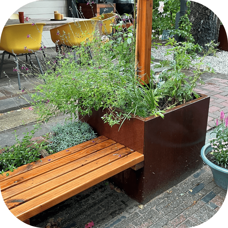V malé zahradě je užitečné, když nábytek má více než jednu funkci. Například si vyberte cortenové květináče se zabudovanou lavicí z douglasky.