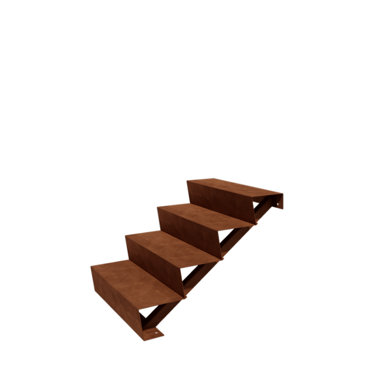 Tato schodiště jsou vyrobena z vysoce kvalitního plechu Corten-A. Tento typ kovu má jedinečnou vlastnost, že vytváří velmi hustou oxidovou vrstvu (rez). Prorezavění je tímto nemožné. Díky husté oxidové vrstvě je hlouběji ležící materiál chráněn před kyslíkem, což výrazně zpomaluje oxidaci, zatímco koroze pokračuje. Schodiště z cortenové oceli je dodáváno bez rzi, v šedé kovové barvě. Začátek procesu rzi nastává během prvních 2 měsíců, není potřeba žádná údržba. Během procesu rzi může schodiště zanechávat stopy. Cortenová ocel je kovová slitina, která se skládá z železa, ke kterému byly přidány měď, fosfor, křemík, nikl a chrom.
